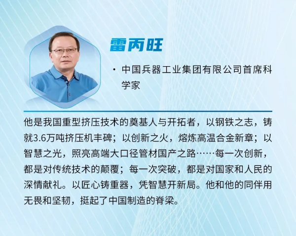 近日,《科學(xué)中國人》雜志社發(fā)布2024“年度科技人物”榜單,中國兵器首席科學(xué)家、北重集團(tuán)雷丙旺當(dāng)選“影響力科學(xué)家”。 雷丙旺是我國極端金屬擠壓技術(shù)的開拓者,扎根邊疆地區(qū)國防特大型企業(yè)工作38年,長期從事金屬成形制造裝備與工藝研究工作。他研制出我國極限制造的大國重器——3.6萬噸黑色金屬垂直擠壓機(jī),一舉打破國外技術(shù)封鎖,填補(bǔ)國內(nèi)空白,實(shí)現(xiàn)了超(超)臨界電站核心管道和航空發(fā)動機(jī)高壓渦輪盤粉末合金棒材的中國制造,開發(fā)出成套關(guān)鍵技術(shù),取得一系列原創(chuàng)性成果,促進(jìn)了產(chǎn)業(yè)的融合發(fā)展,創(chuàng)造巨大經(jīng)濟(jì)社會效益。