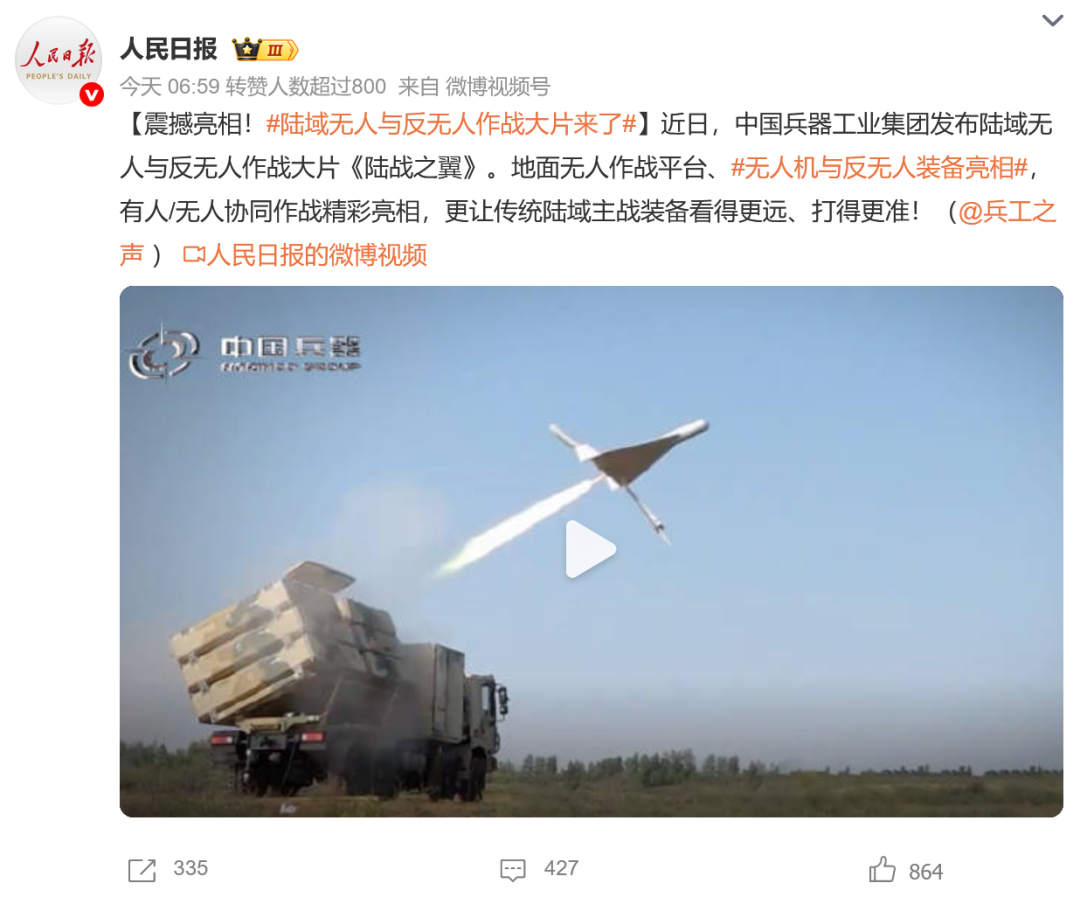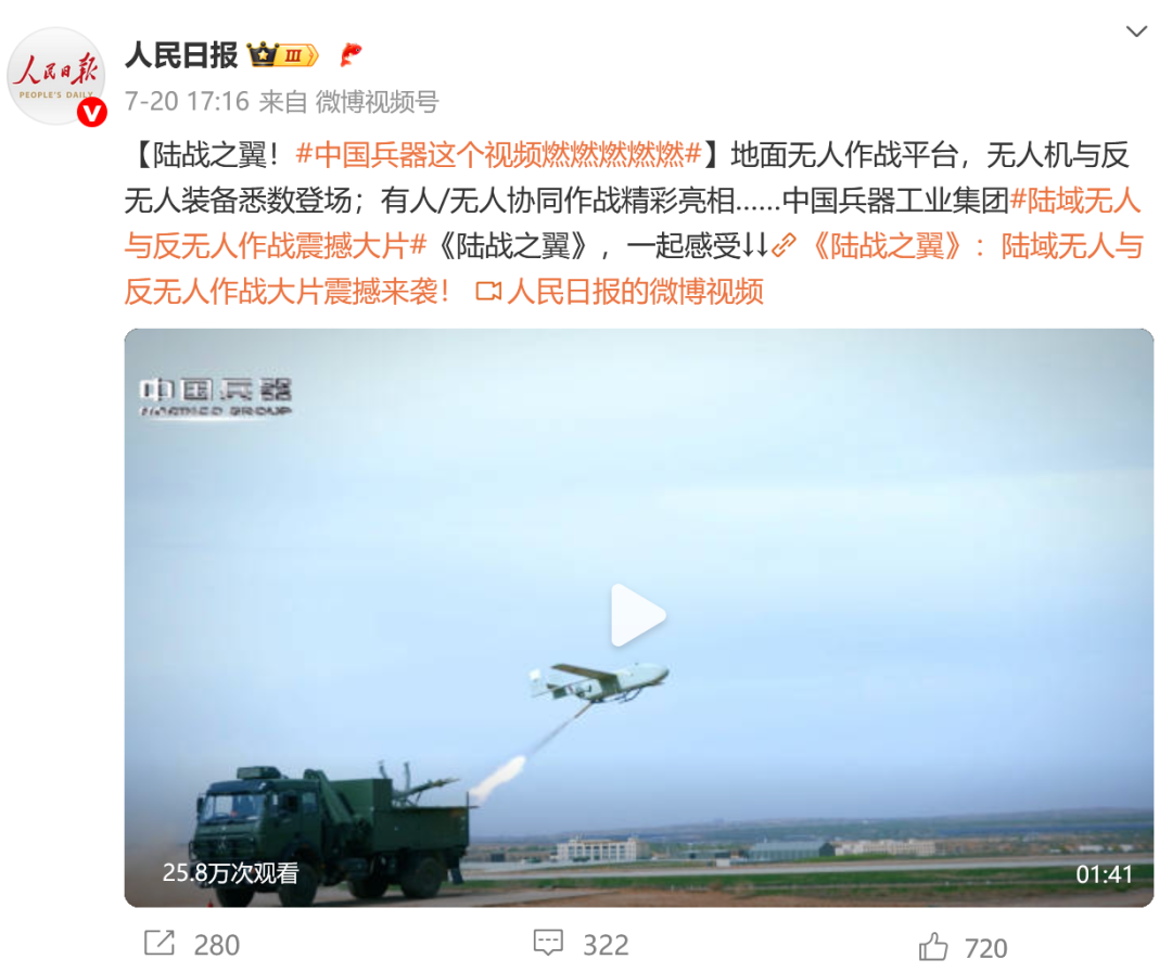 人民日報(bào)微博、央視軍事微博、央視新聞客戶端、中國新聞網(wǎng)、中新社國是直通車抖音、環(huán)球網(wǎng)微博、環(huán)球時(shí)報(bào)(X平臺(tái)、英文版客戶端)、中國日報(bào)網(wǎng)、央視軍事報(bào)道微博、中國軍號(hào)微博、中央廣播電視總臺(tái)“空天逐夢”微信視頻號(hào)、共青團(tuán)中央B站、國資小新微博等中央主流媒體、國家部委的新媒體播發(fā)集團(tuán)公司陸域無人與反無人作戰(zhàn)大片等視頻作品。