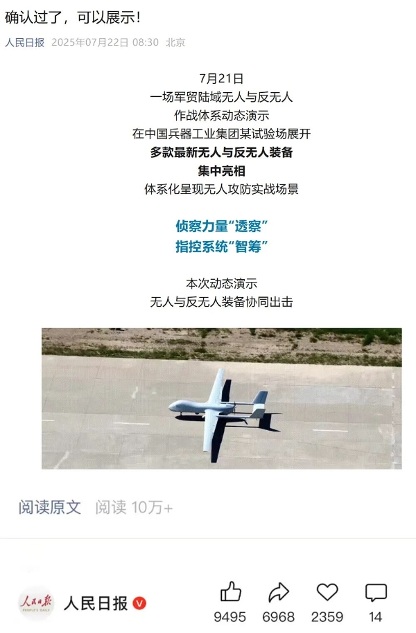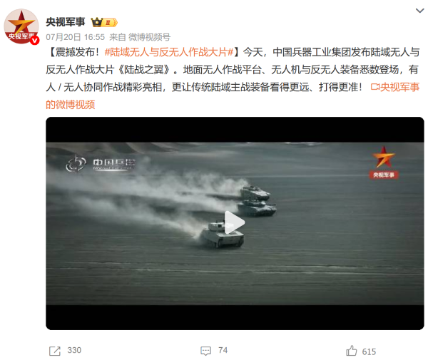 央視新聞客戶端:兵器工業(yè)集團(tuán)陸域無人與反無人作戰(zhàn)體系震撼來襲!搶先看!2025-07-24